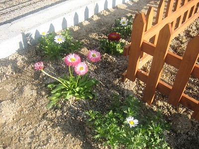 畑の柵のまわりにデージーやノースポールをちょこちょこ植えて、